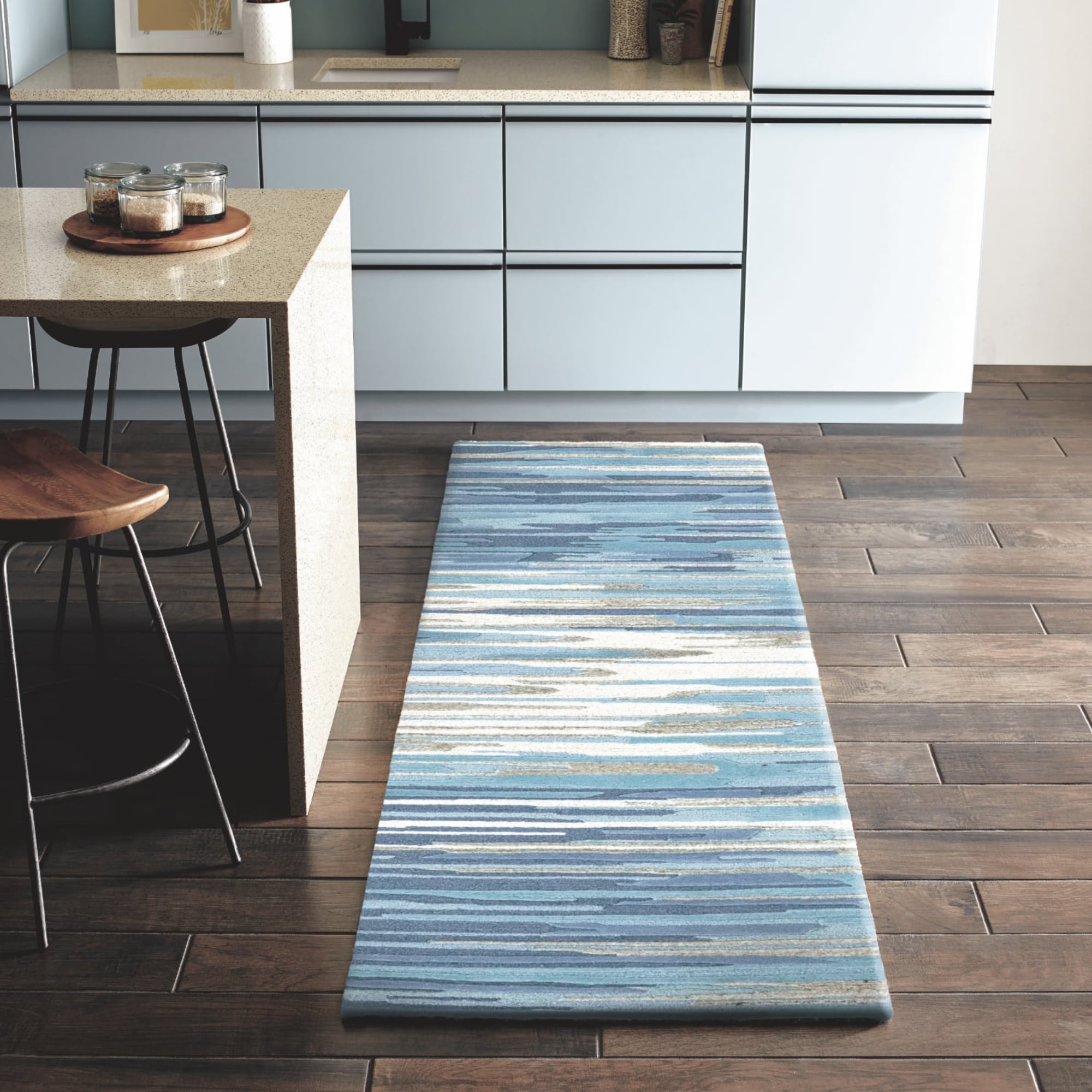 See beyond the horizon. Reminiscent of the serenity found in the striations of clouds drifting across the sky, this contemporary design wows. The abstract design offers texture with high to low tufting for a plush feel underfoot.