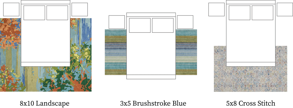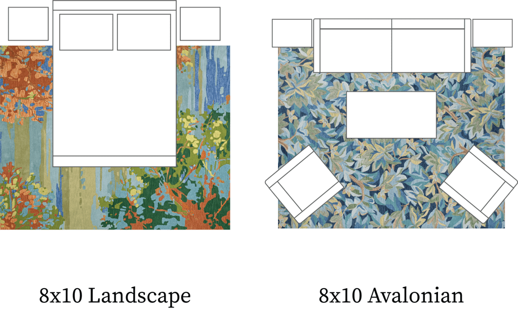 Generally, you will want any furnishings to touch the rug helping to create a sense of grounding. The sofa, for example, can be pulled all the way forward or simply have the front legs on the rug. A bed can be more creatively placed. By either placing the rug under the bed or using smaller rugs around the bed, you can easily find something that will create impact while fitting into your budget.