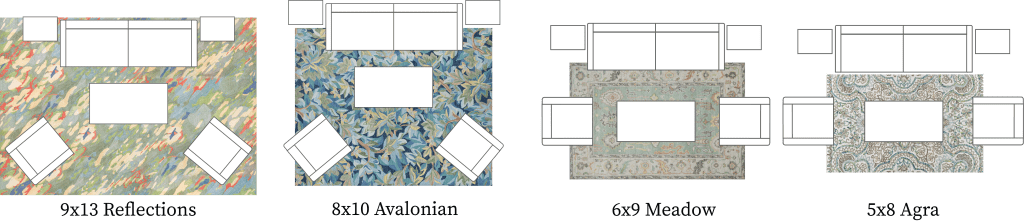 When designing a living room, the size of the rug can have a big impact on how the space feels. A basic seating arrangement can help you determine the appropriate size for your rug. As a general rule, a small rug like a 5×8 may feel too cramped if you have a large, open-concept space but sometimes is the perfect solution to a small room. Even when using a smaller rug, it’s important to make sure that most of the furniture legs are on or very near the edge of the rug.