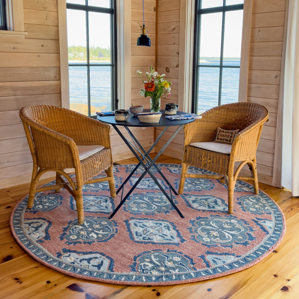 We styled our Vintage Glory rug with wicker chairs and a bistro table for a cozy dining spot in a coastal cottage.